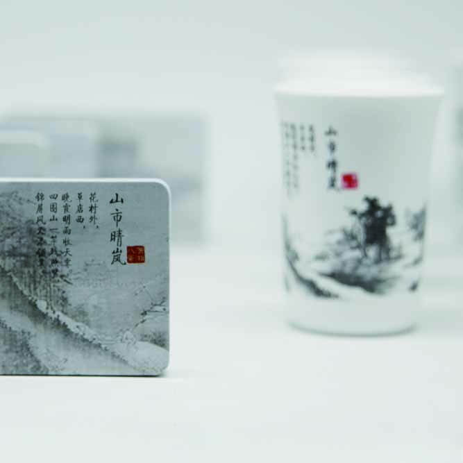 八杯:手握圆柱型深杯,杯面上分别印有北宋宋迪曾选取湖南潇水、湘水合流处的八处景色。